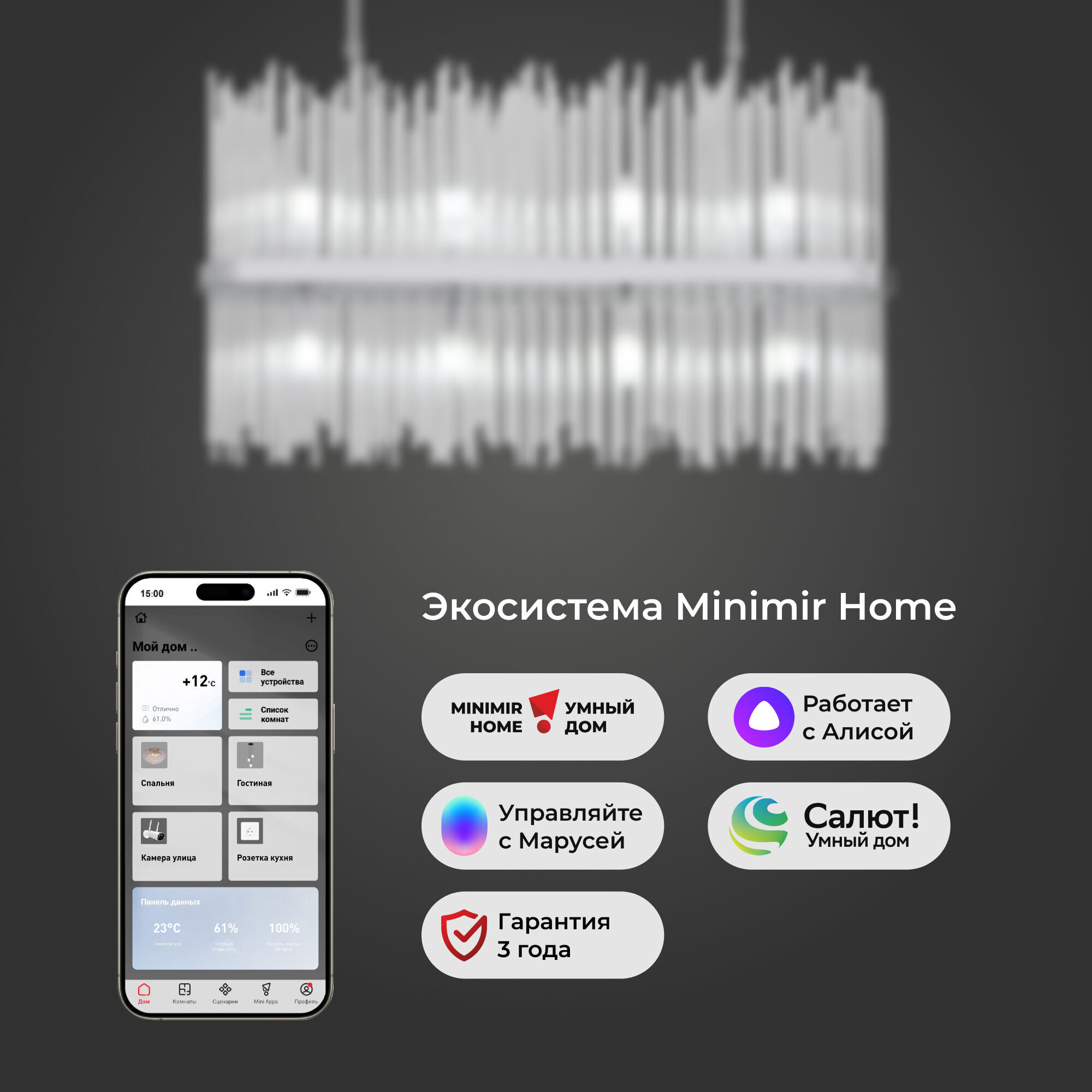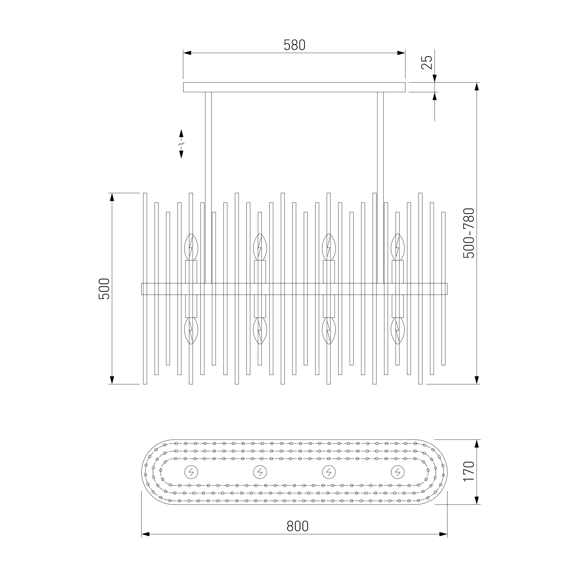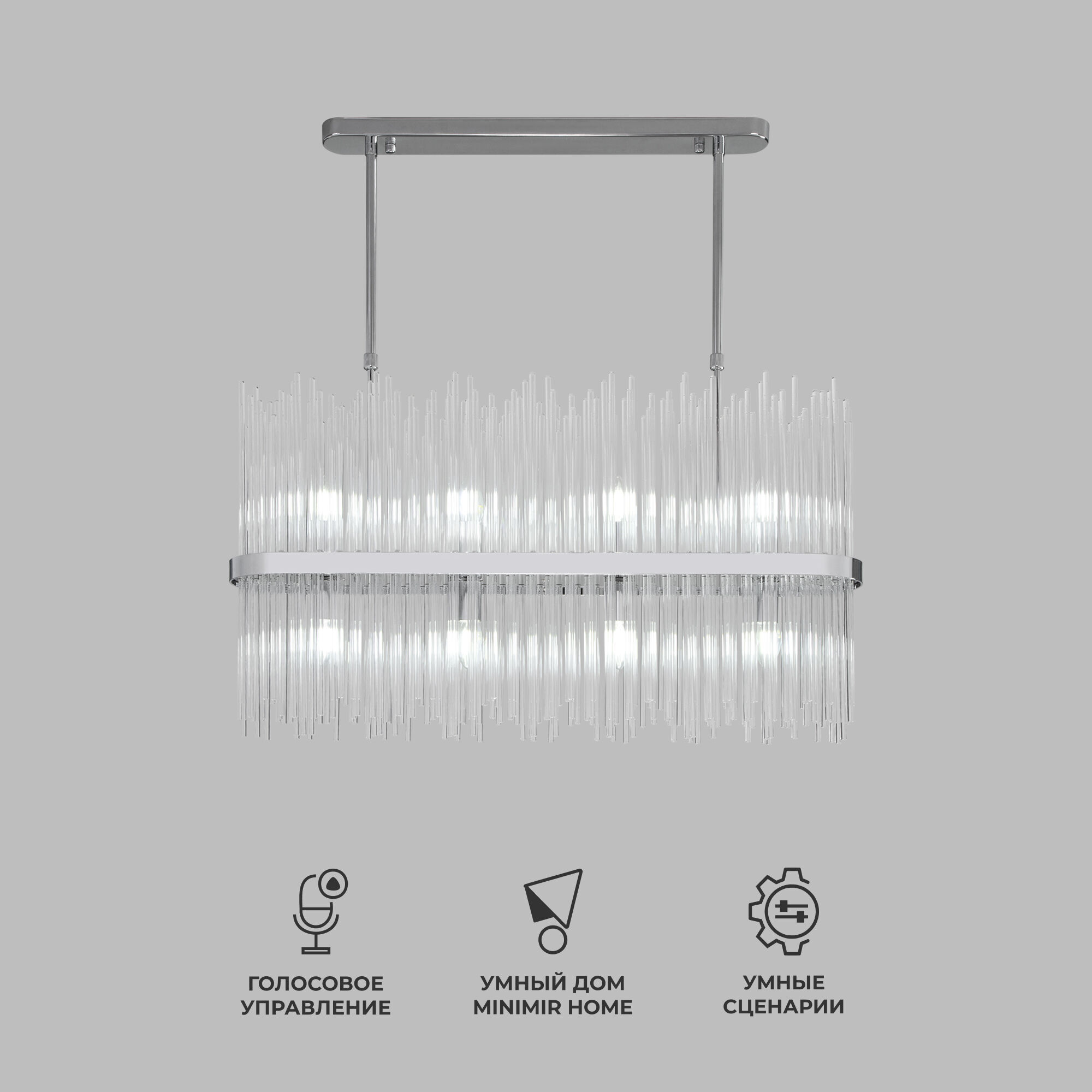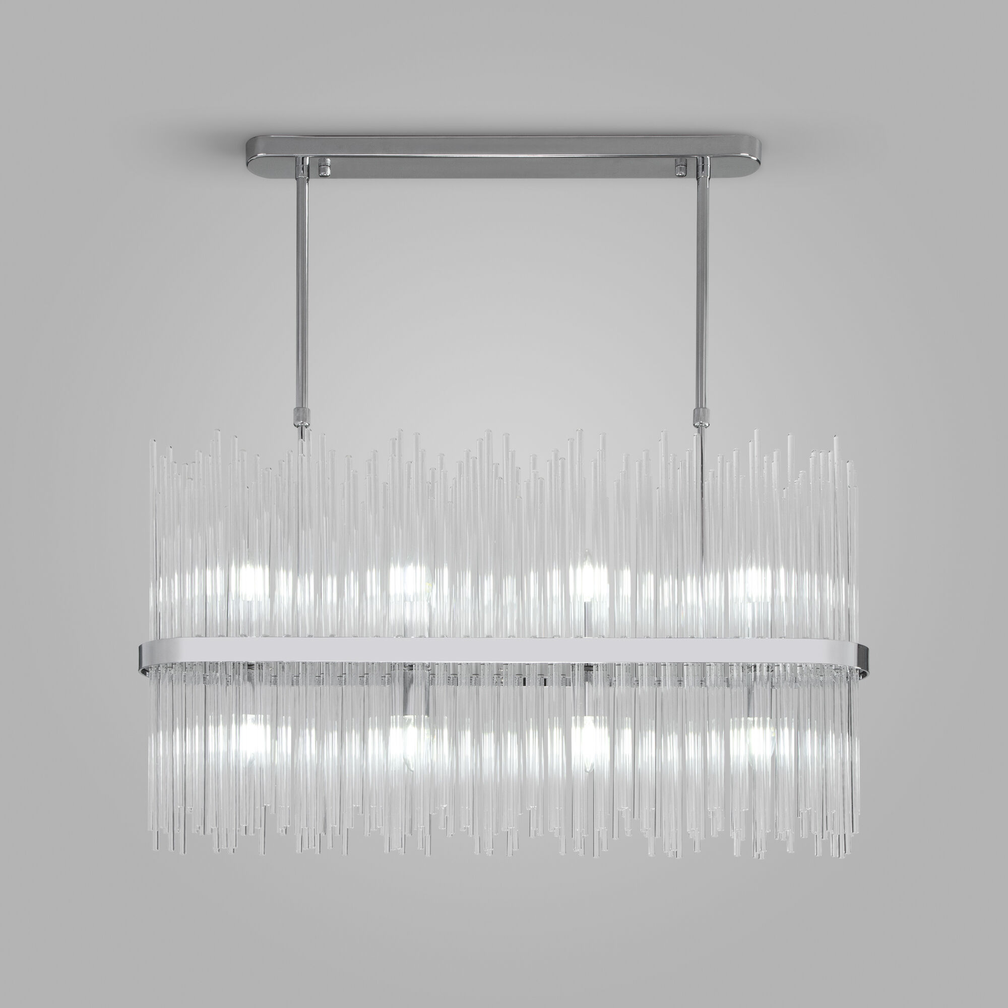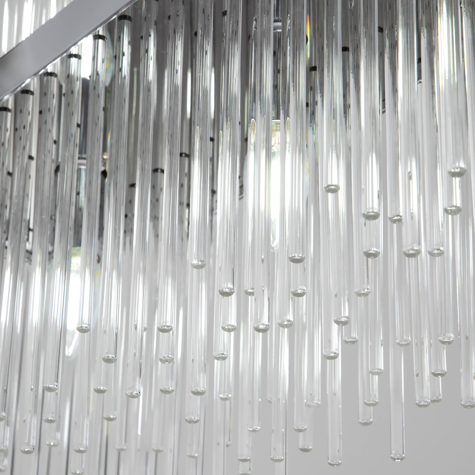 Декоративные стеклянные трубочки и сменные лампы с цоколем E14 переливаются на свету искристыми завораживающими бликами. В производстве подвесной люстры использовали особое стекло с эффектной огранкой и высококачественный металл с надежным защитным покрытием.