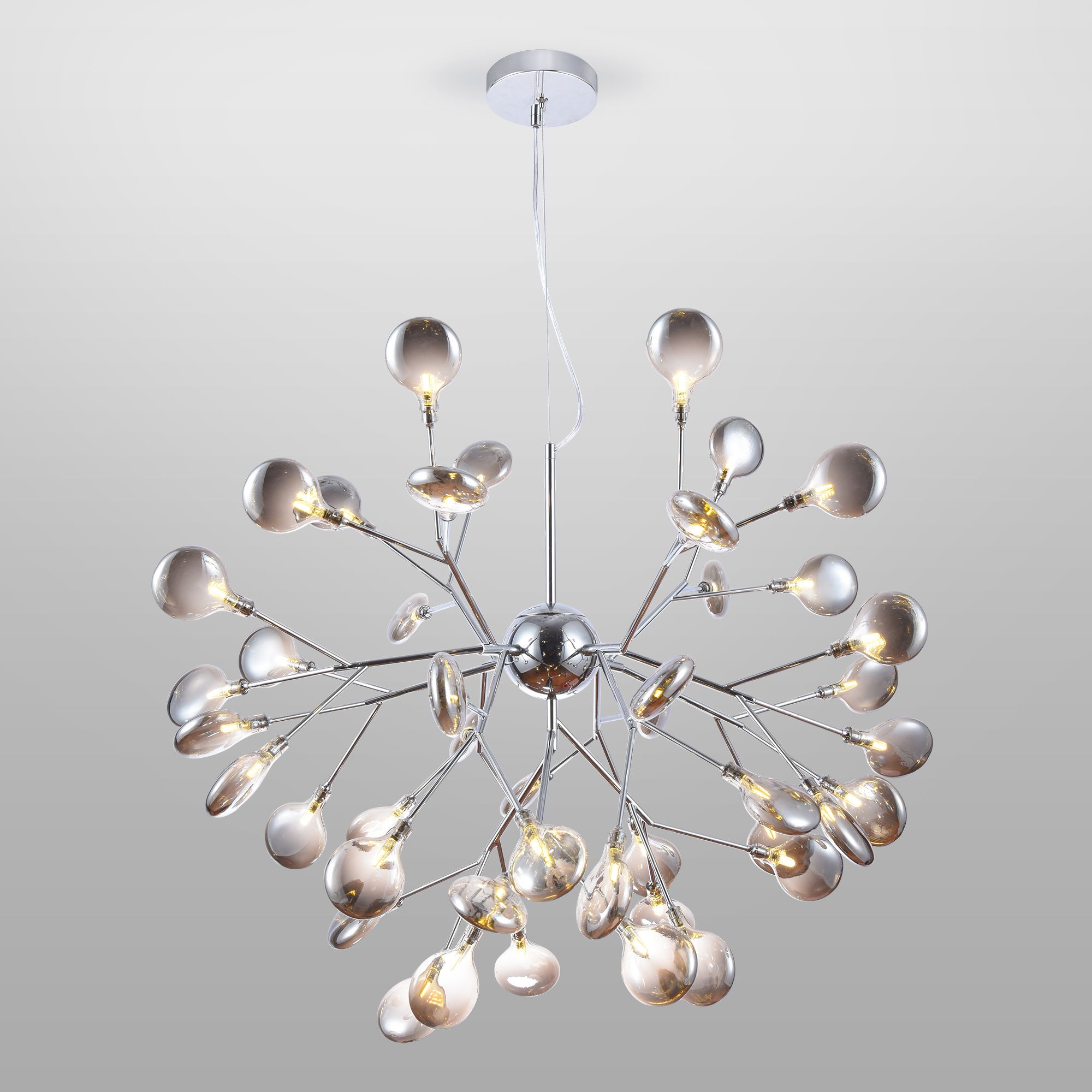Подвесная люстра со стеклянными плафонами 555 в дымчатом цвете предназначена для создания основного освещения в современных и классических интерьерах. Подходит для различных типов помещений: гостиная, загородный дом и рассчитана на площадь освещения 30 м².