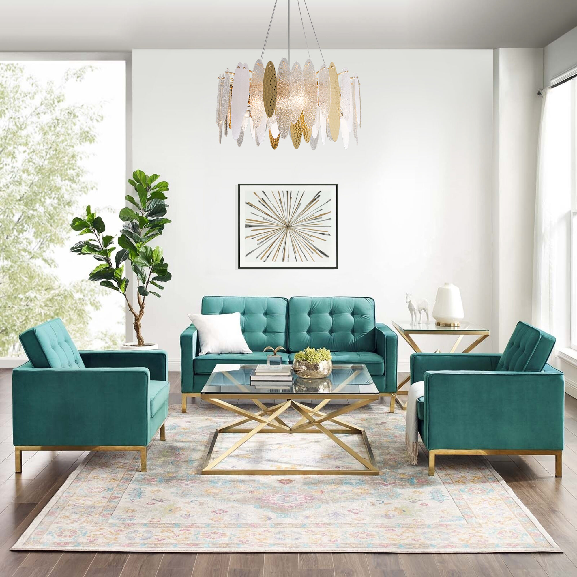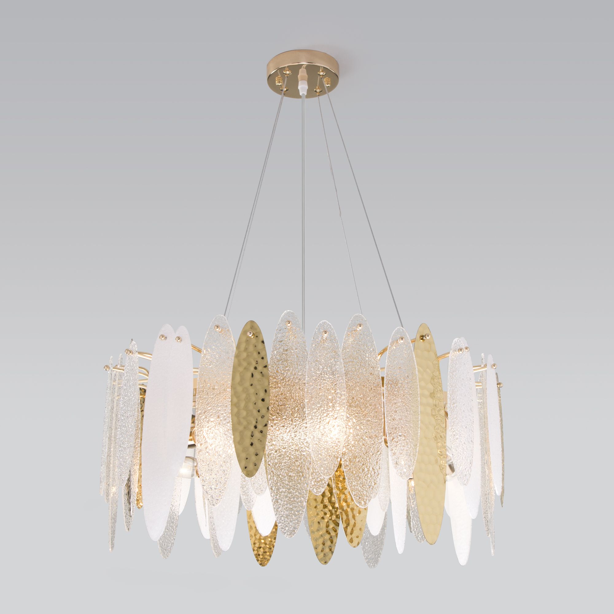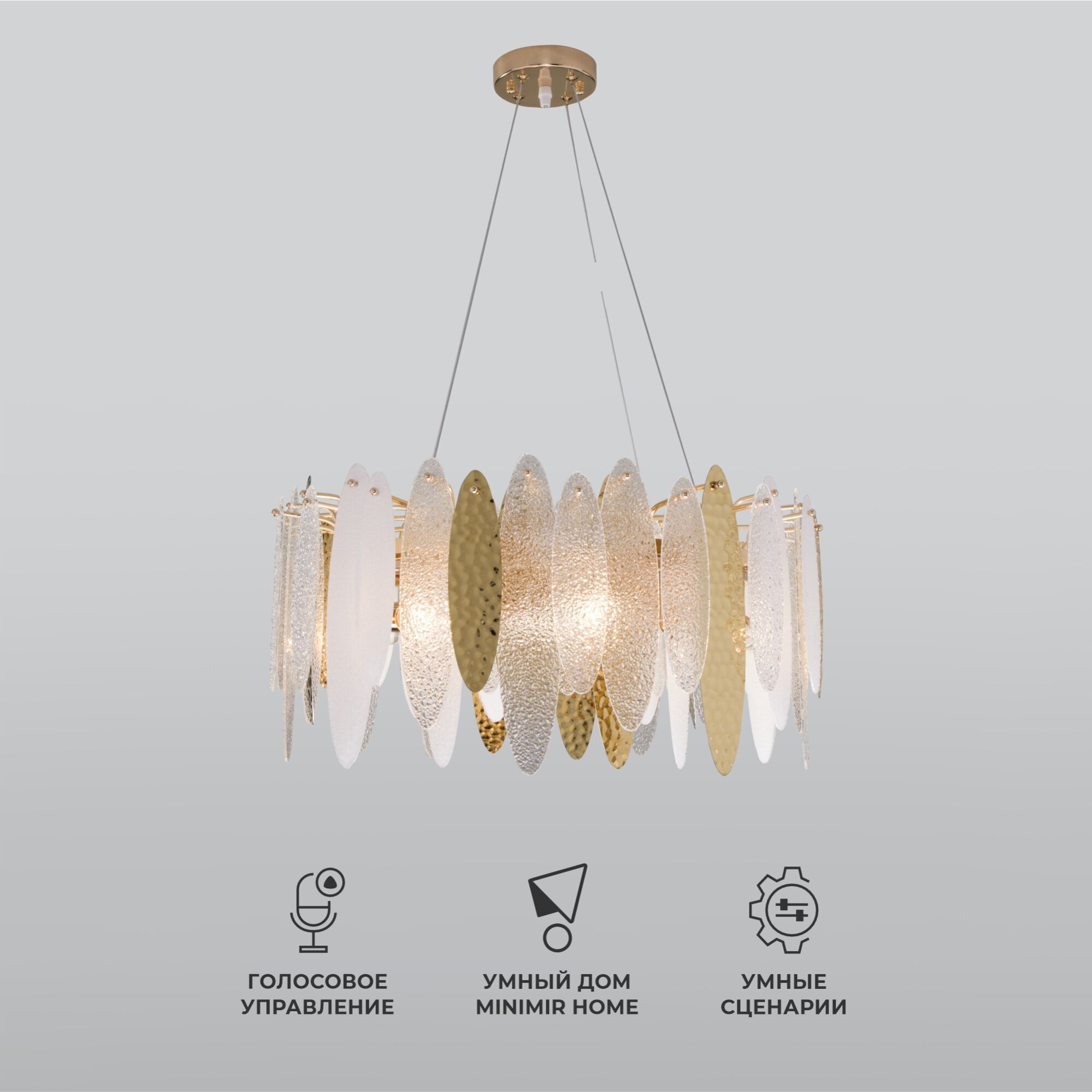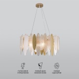 Люстра украшена эффектным декором из фактурного стекла. Арматура цвета золото, изготовлена из высококачественного металла с надежным защитным покрытием.