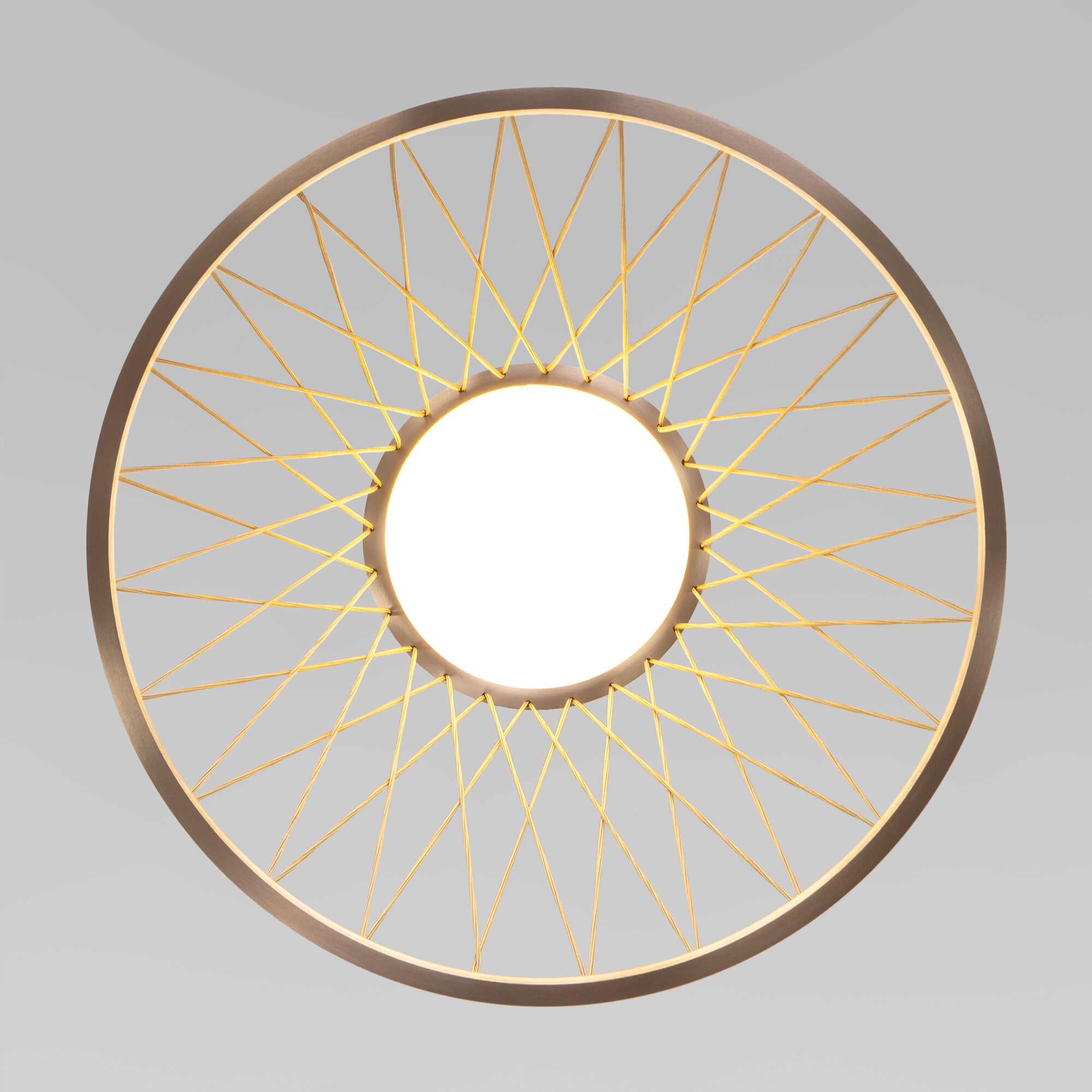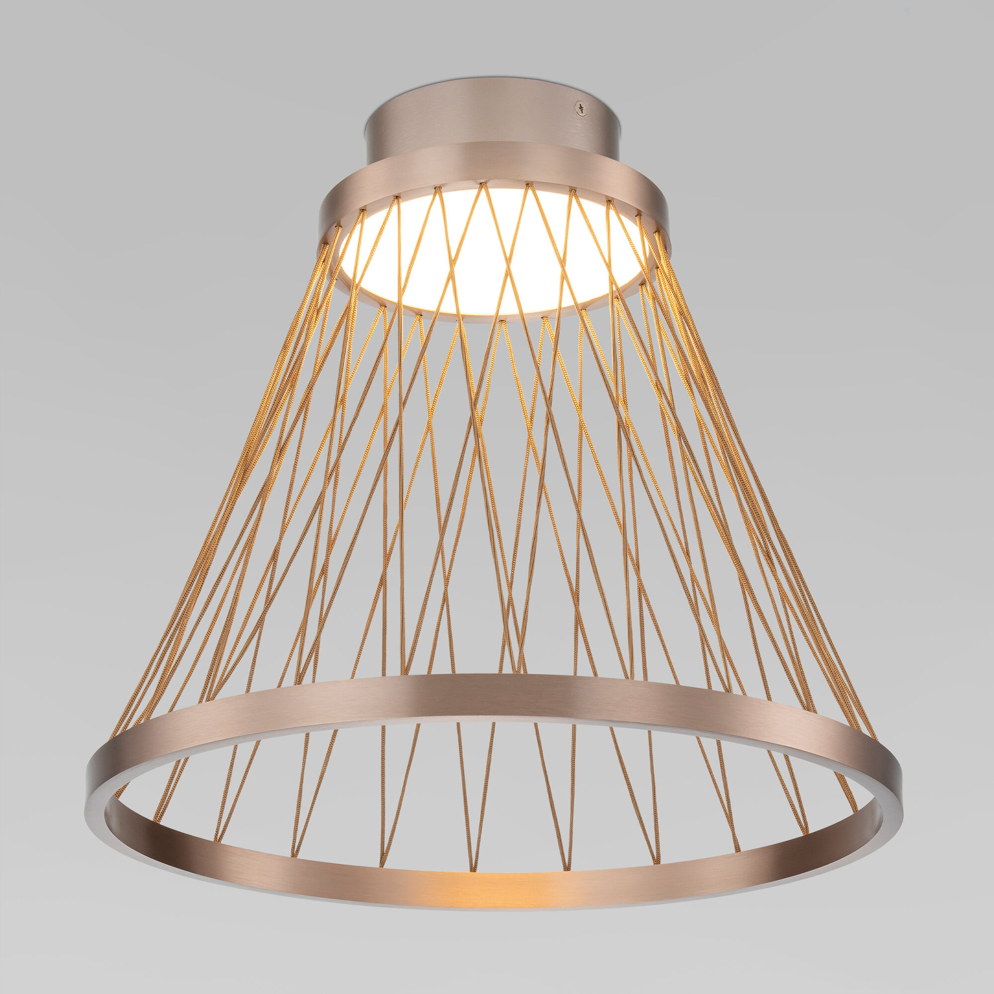 Конструкция состоит из двух дисков кофейного цвета, переплетённых декоративными бронзовыми нитями, благодаря которым создается эффектный световой рисунок. Дизайнерский плафон из нитей обеспечивает визуальную легкость, что особенно актуально в современных интерьерах, где ценится каждая деталь.