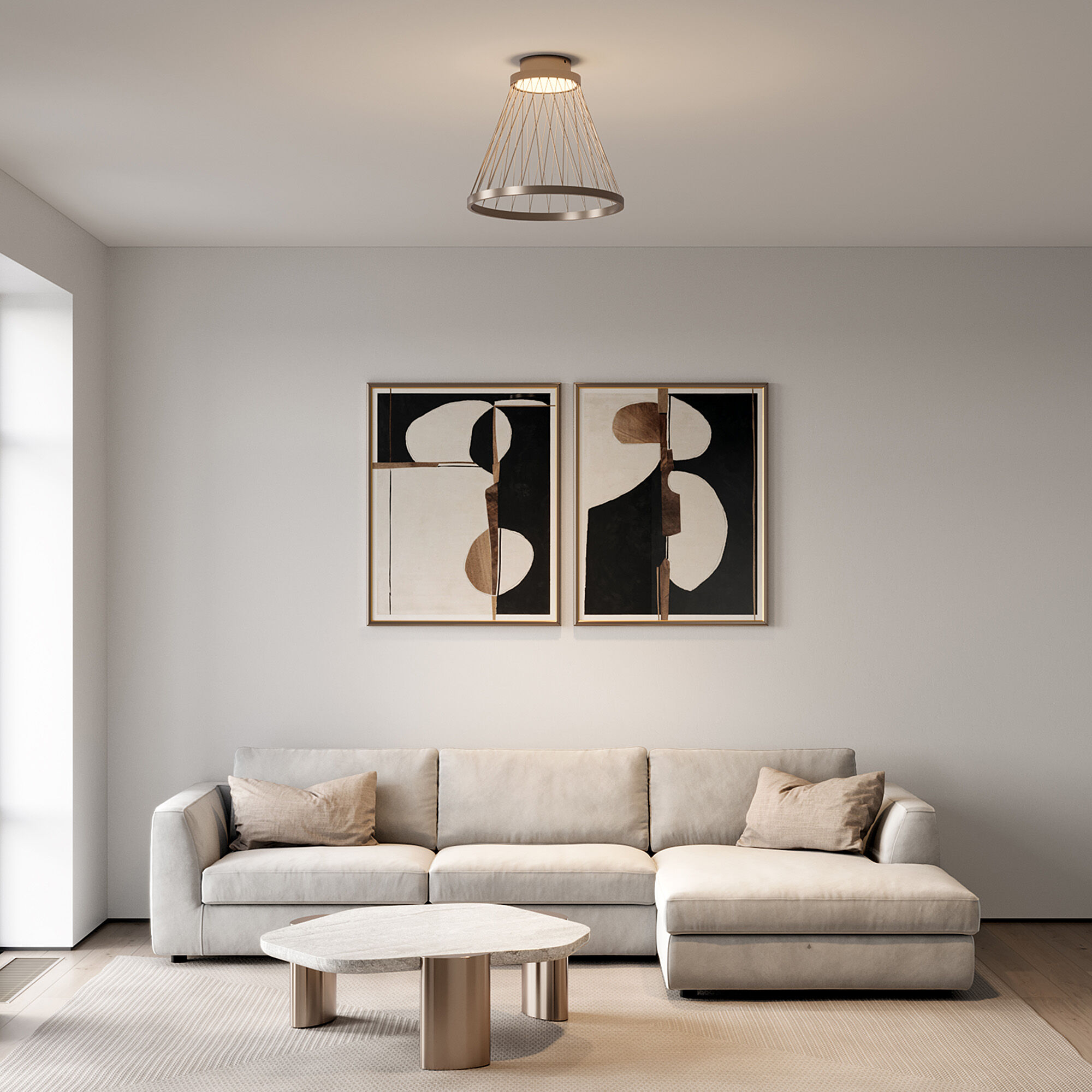 Верхний диск освещает пространство под собой, создавая мягкое и уютное свечение в теплой цветовой температуре, преображающее интерьер.