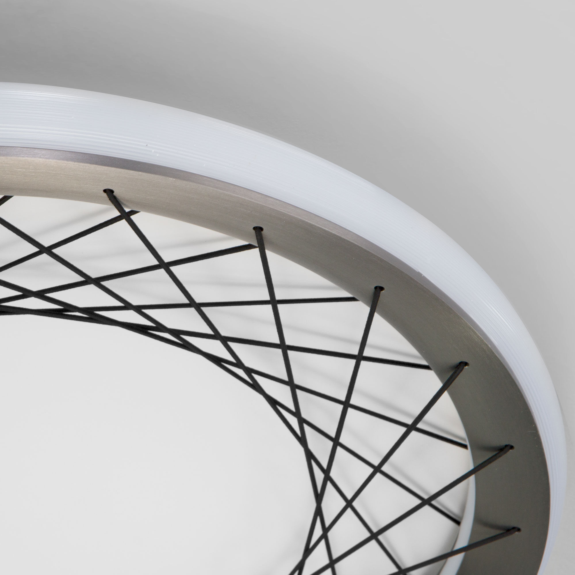 Каждая эластичная нить, подобно мастерски выполненному штриху, переплетается в элегантную композицию, формируя уникальную игру света и тени. Круглая форма конструкции, дополненная сдержанным серым цветом, отражает современные тенденции минимализма.