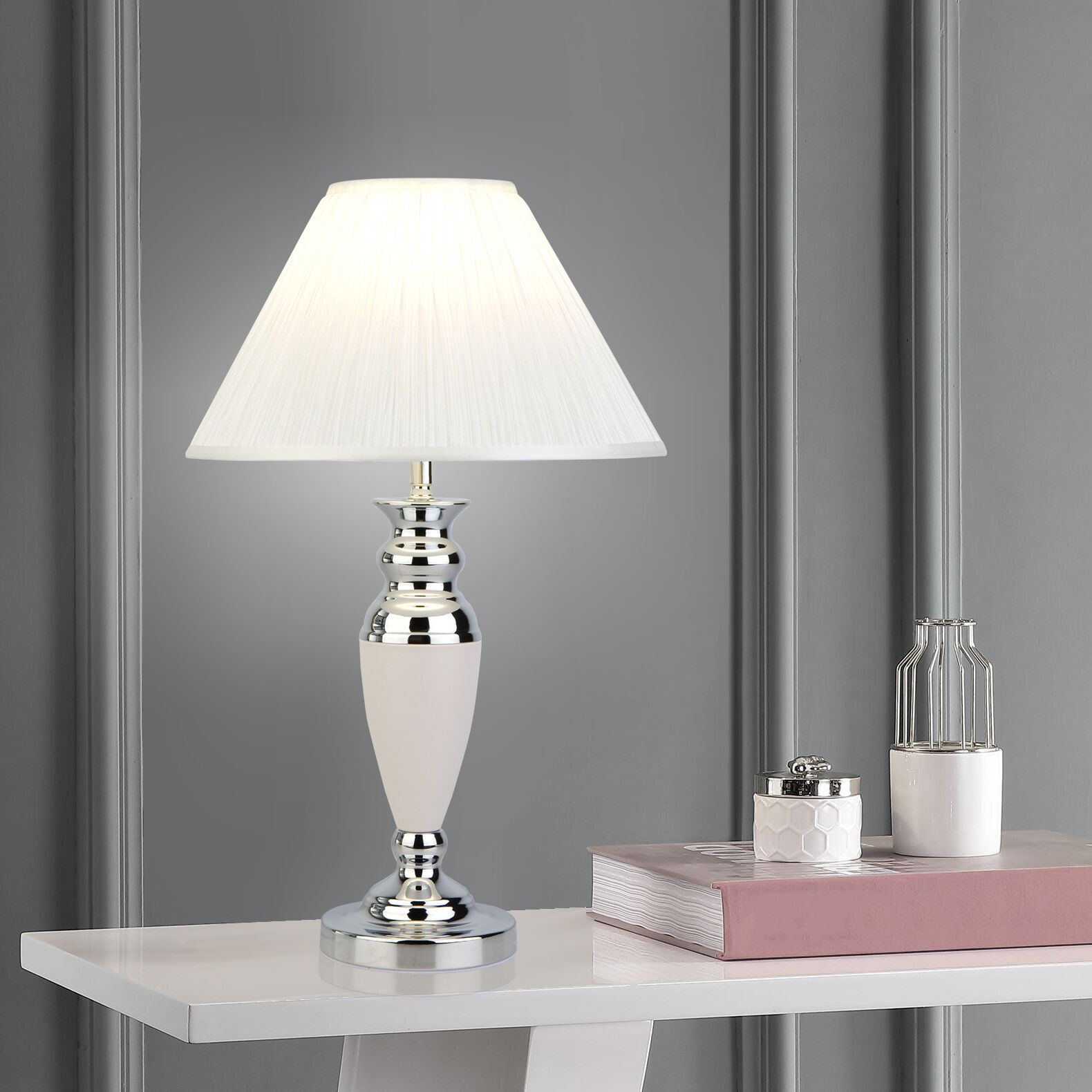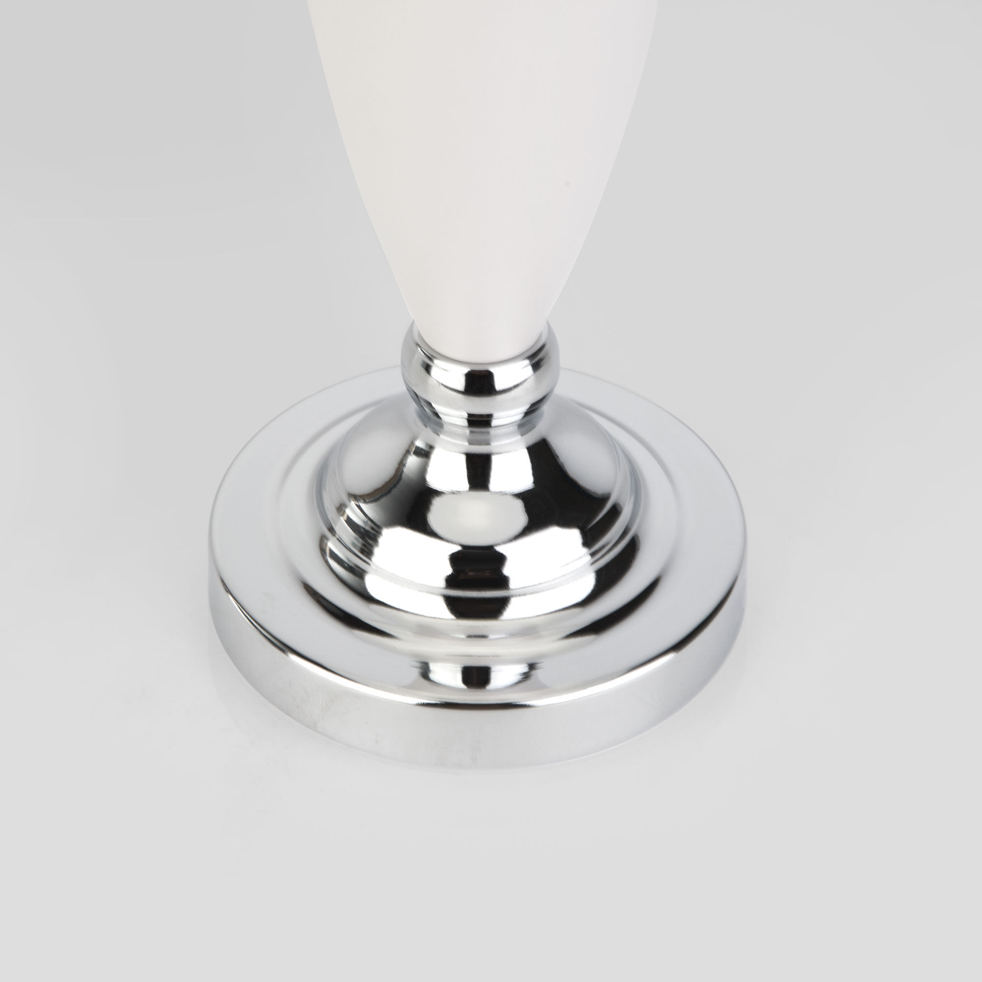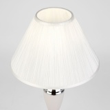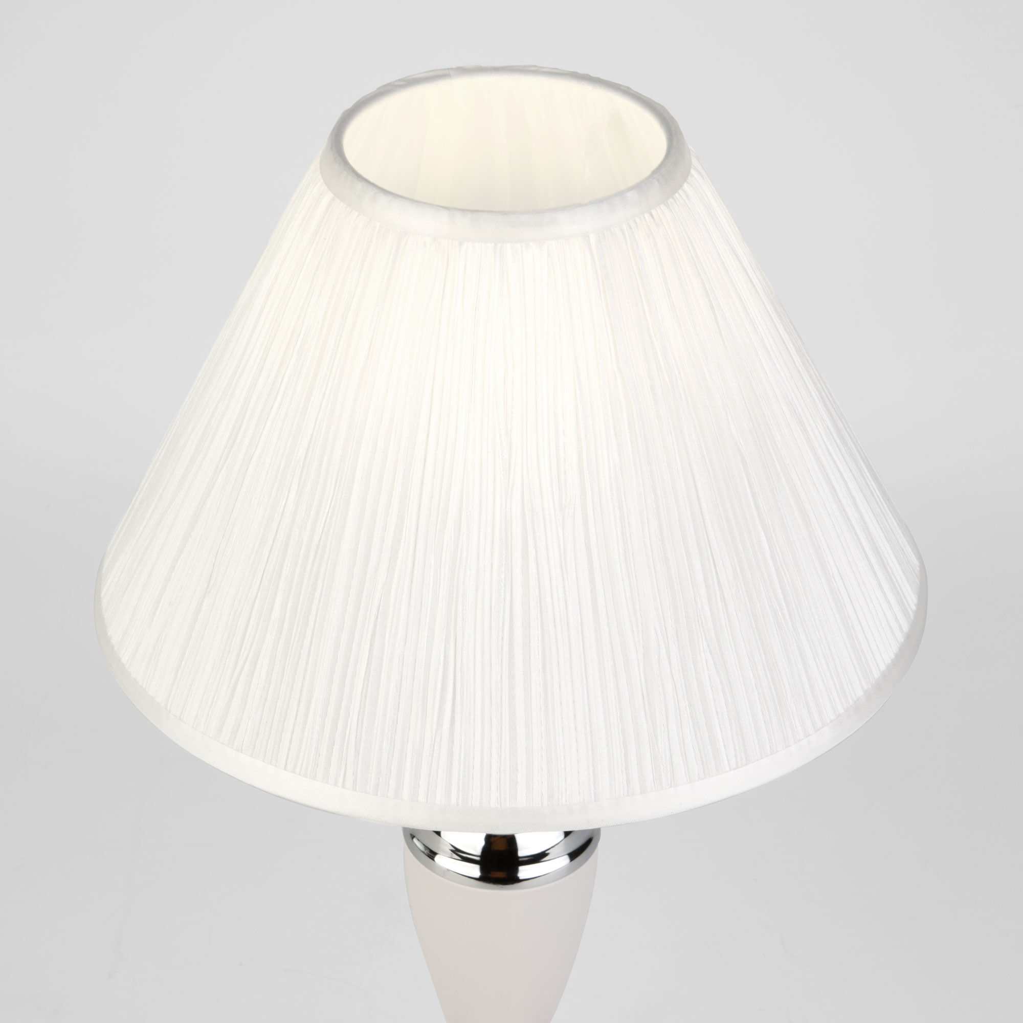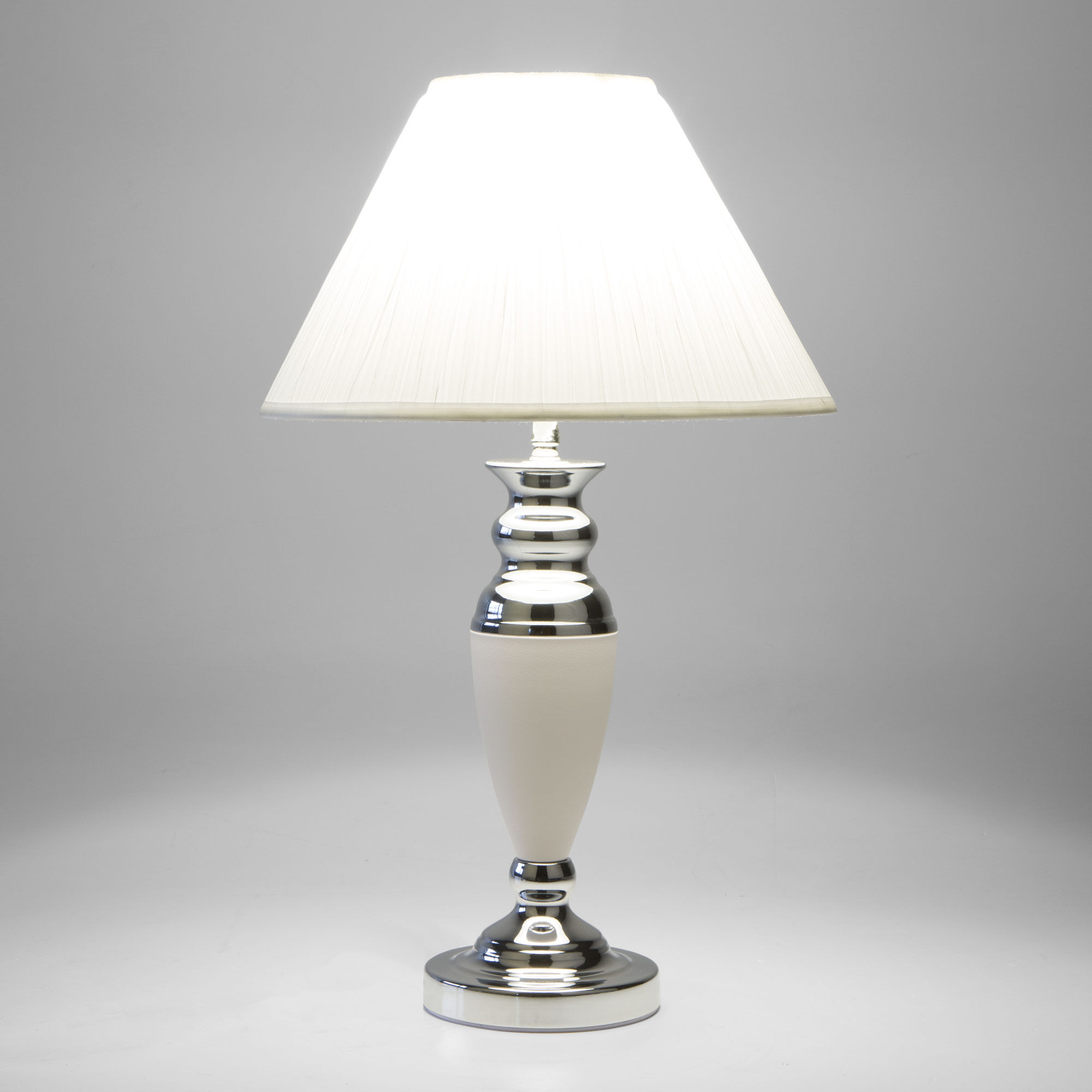 Благодаря белому тканевому абажуру настольная лампа создает мягкое рассеянное свечение, подходящее для комфортного чтения книг в вечернее время. Прочный металлический корпус светильника устойчив к механическим воздействиям, а защитное покрытие обеспечивает надежную электроизоляцию и презентабельный внешний вид.