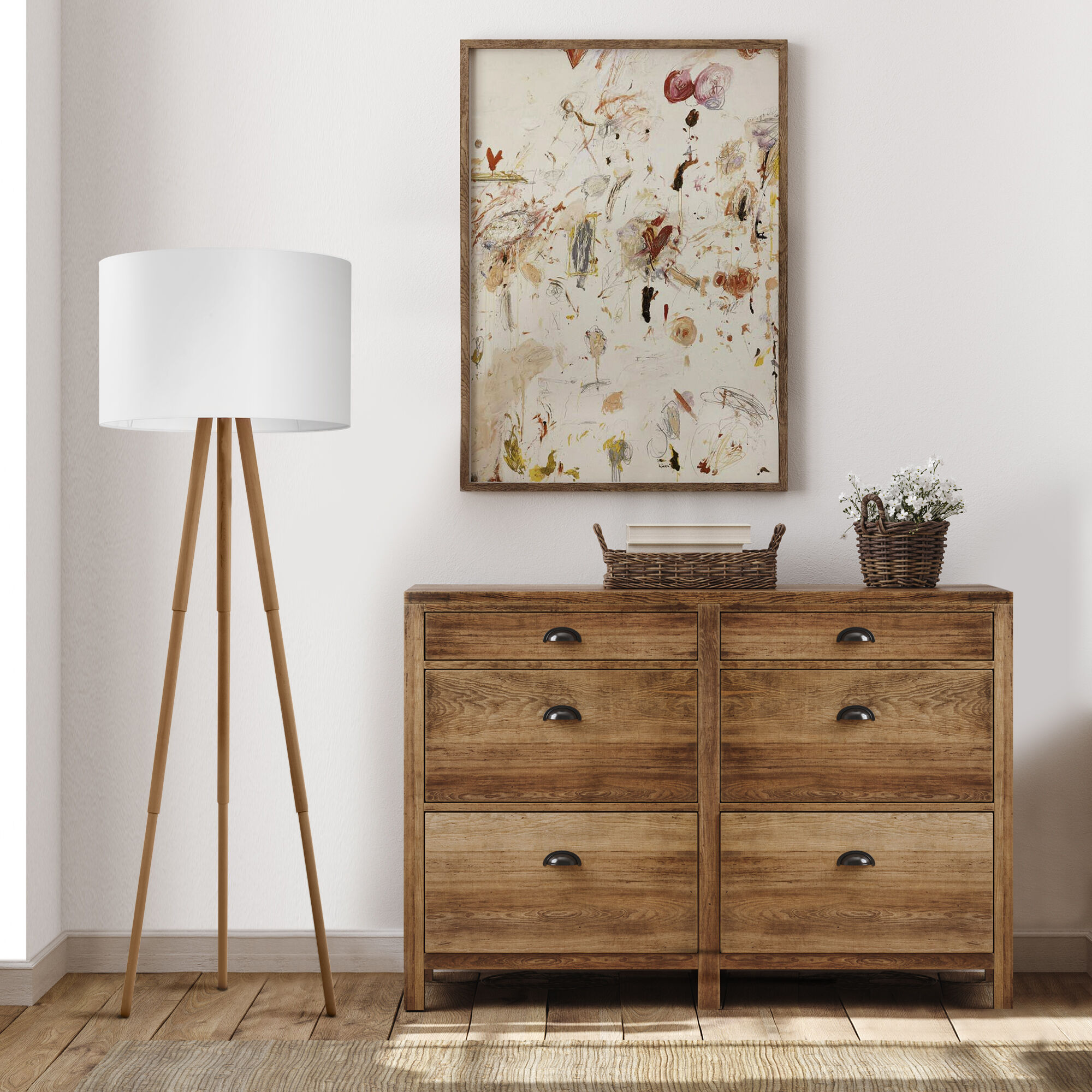 Благодаря белому тканевому абажуру напольный светильник создает мягкое рассеянное свечение. Прочный деревянный корпус светильника устойчив к механическим воздействиям, а защитное покрытие обеспечивает надежную электроизоляцию и презентабельный внешний вид.